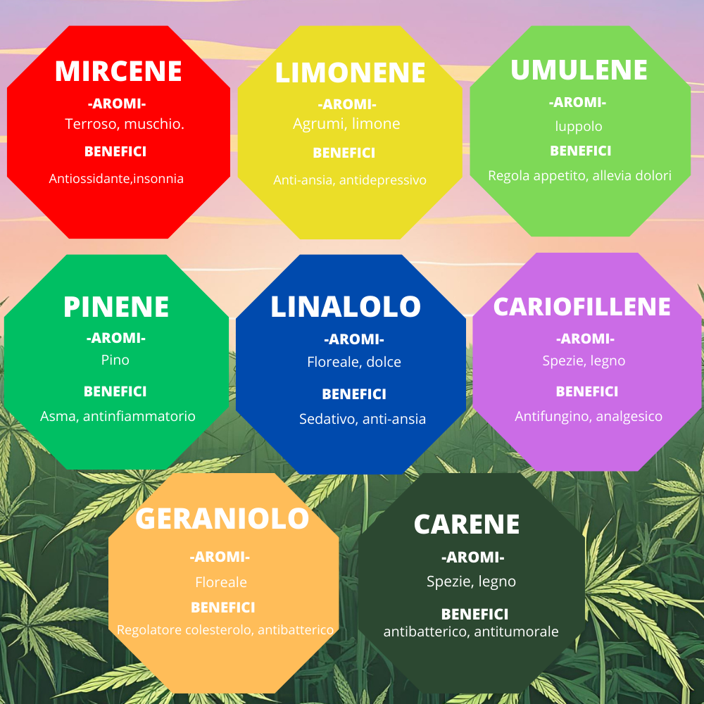 I terpeni e terpenoidi sono sostanze chimiche naturali, responsabili delle proprietà olfattive e di gusto di molte piante e animali. Sono anche i principali componenti degli oli essenziali e vengono usati in profumi, cosmetici, alimenti e bevande.